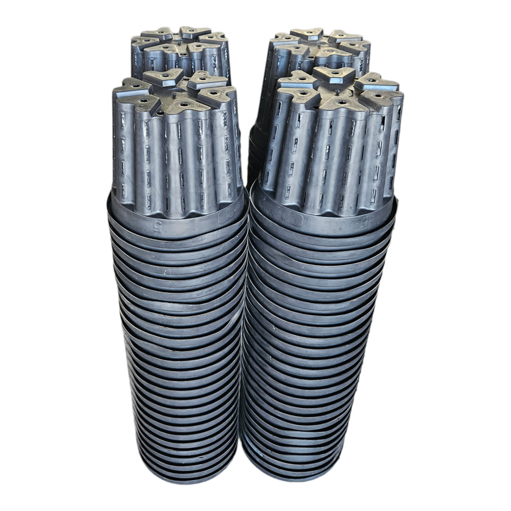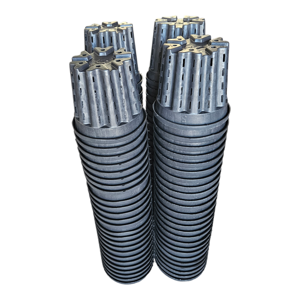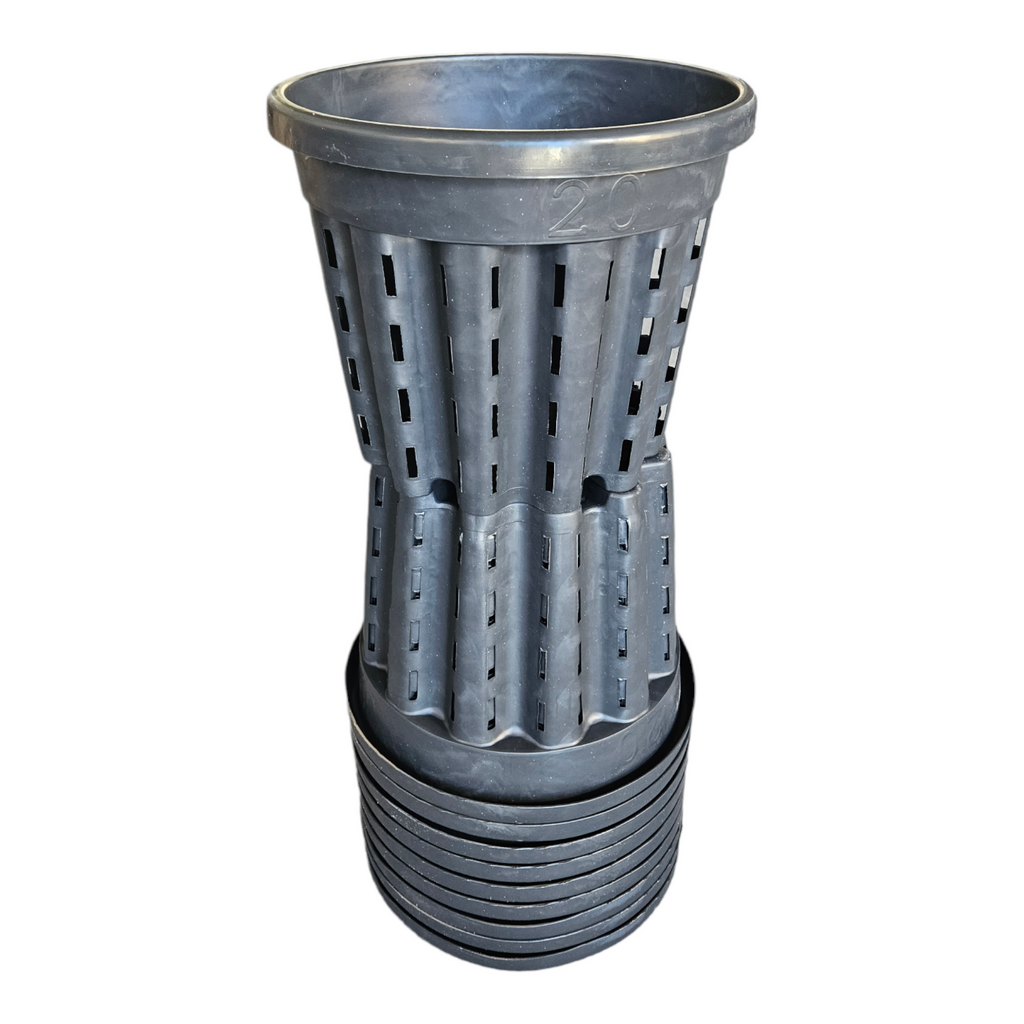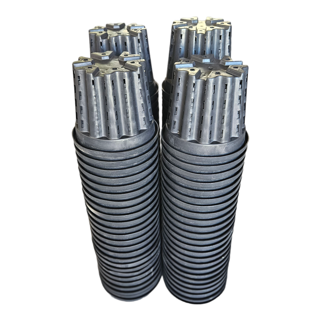 The structure of an aero pot typically consists of heavy-duty polyethylene material, with many small holes or slits in the sides and bottom. Besides allowing for optimal drainage, these openings enable air to reach the roots, facilitating root pruning. As the roots encounter air, the tips die back, causing the roots to develop additional branching behind the ‘air-pruned’ tips. This process prevents roots circling the pot and the plant becoming ‘root bound’, and creates denser, more fibrous root growth, with more root tip growth points leading to faster overall growth and the development of a vigorous, healthy plant.