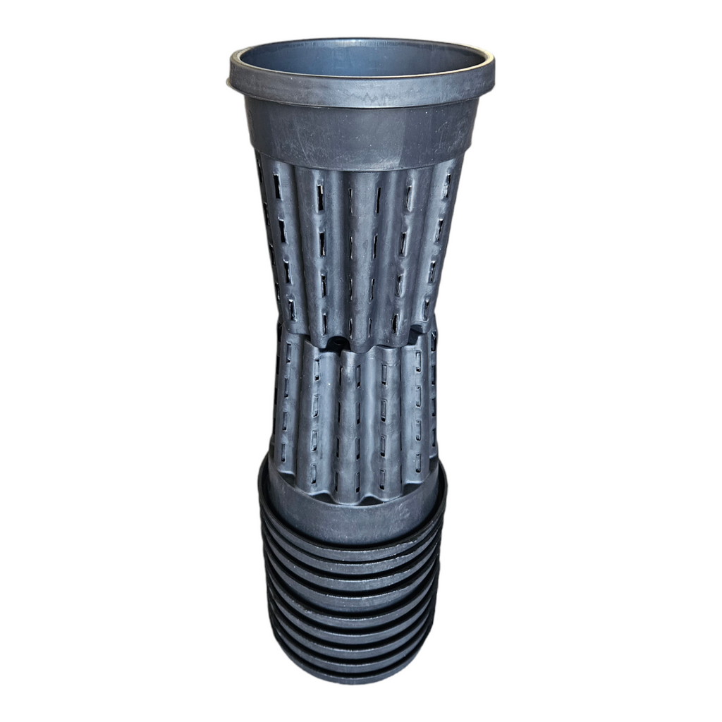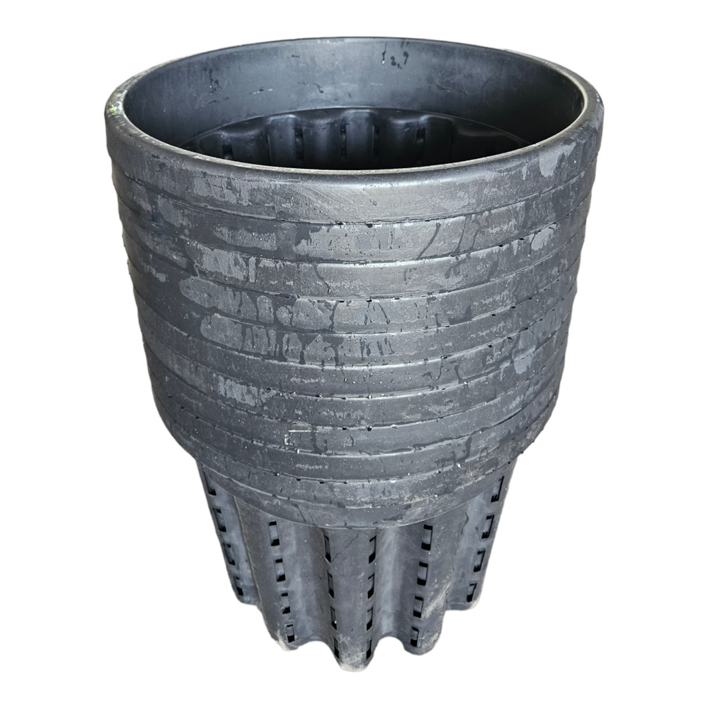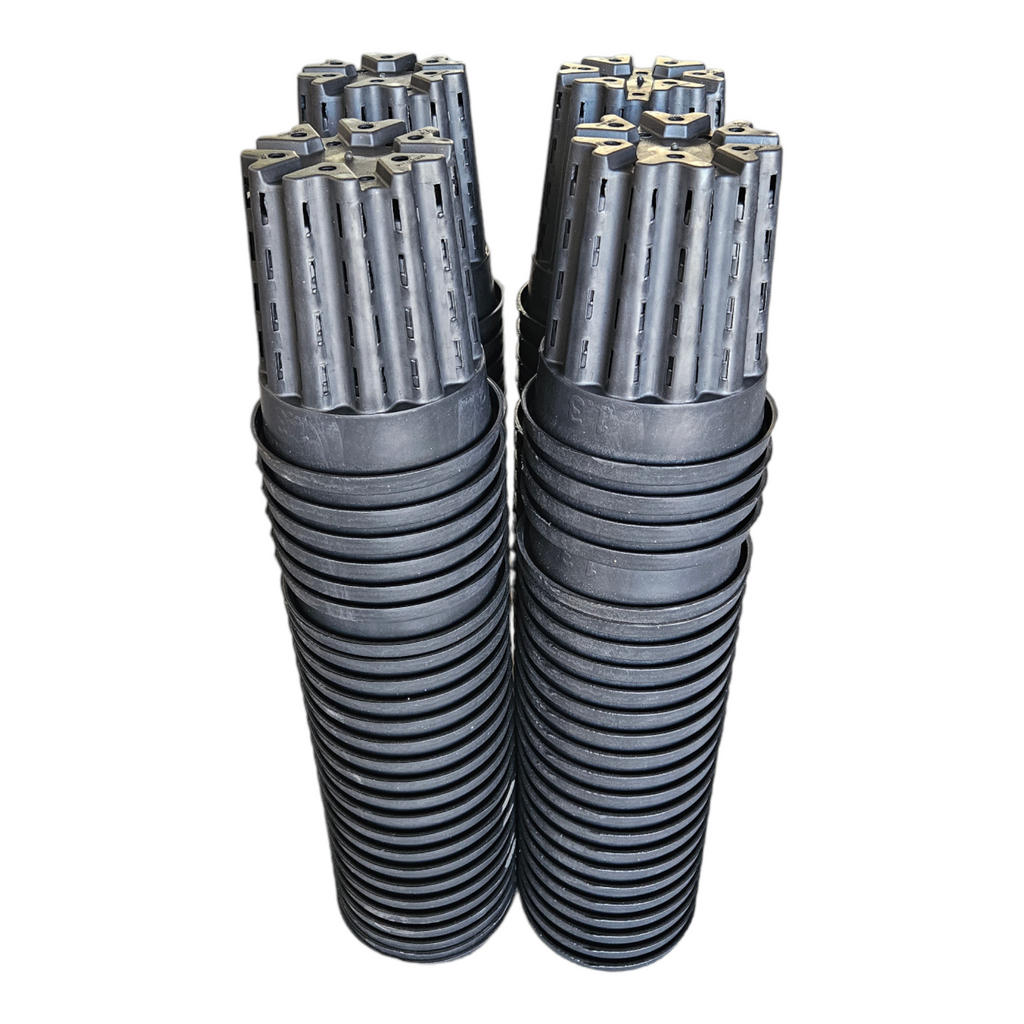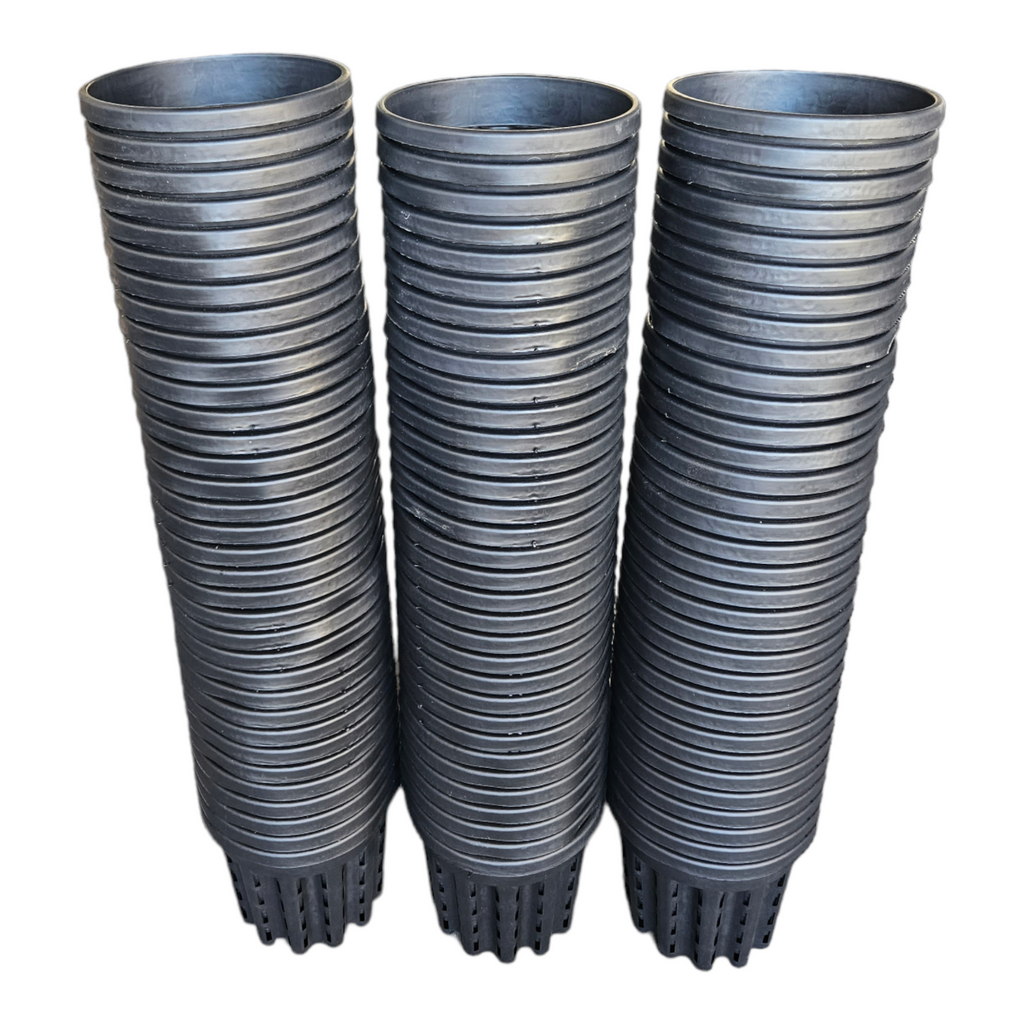The structure of an aero pot typically consists of heavy-duty polyethylene material, with many small holes or slits in the sides and bottom. Besides allowing for optimal drainage, these openings enable air to reach the roots, facilitating root pruning. As the roots encounter air, the tips die back, causing the roots to develop additional branching behind the ‘air-pruned’ tips. This process prevents roots circling the pot and the plant becoming ‘root bound’, and creates denser, more fibrous root growth, with more root tip growth points leading to faster overall growth and the development of a vigorous, healthy plant.